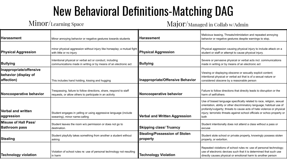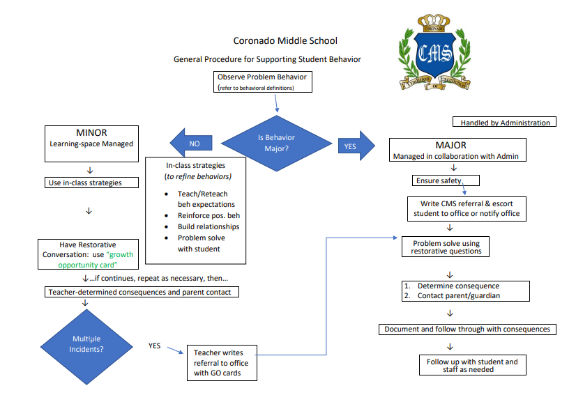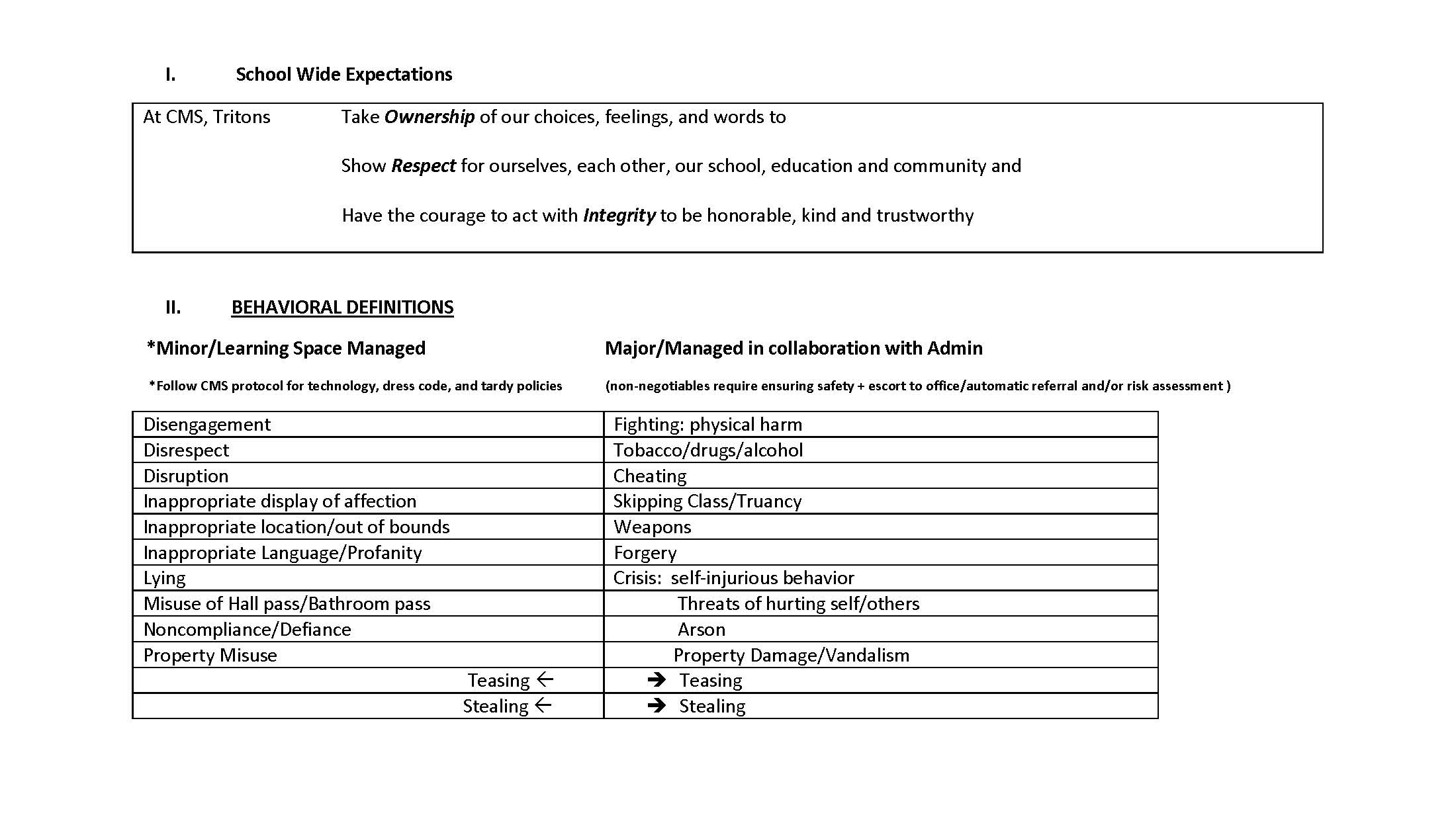 MTSS offers a framework for educators to engage in data-based decision-making related to program improvement, high-quality instruction and intervention, social and emotional learning, and positive behavioral support. School-wide positive behavioral interventions and supports (SWPBIS) are an essential component of the MTSS framework. CMS behavioral expectations and flow chart for decision making are outlined below: