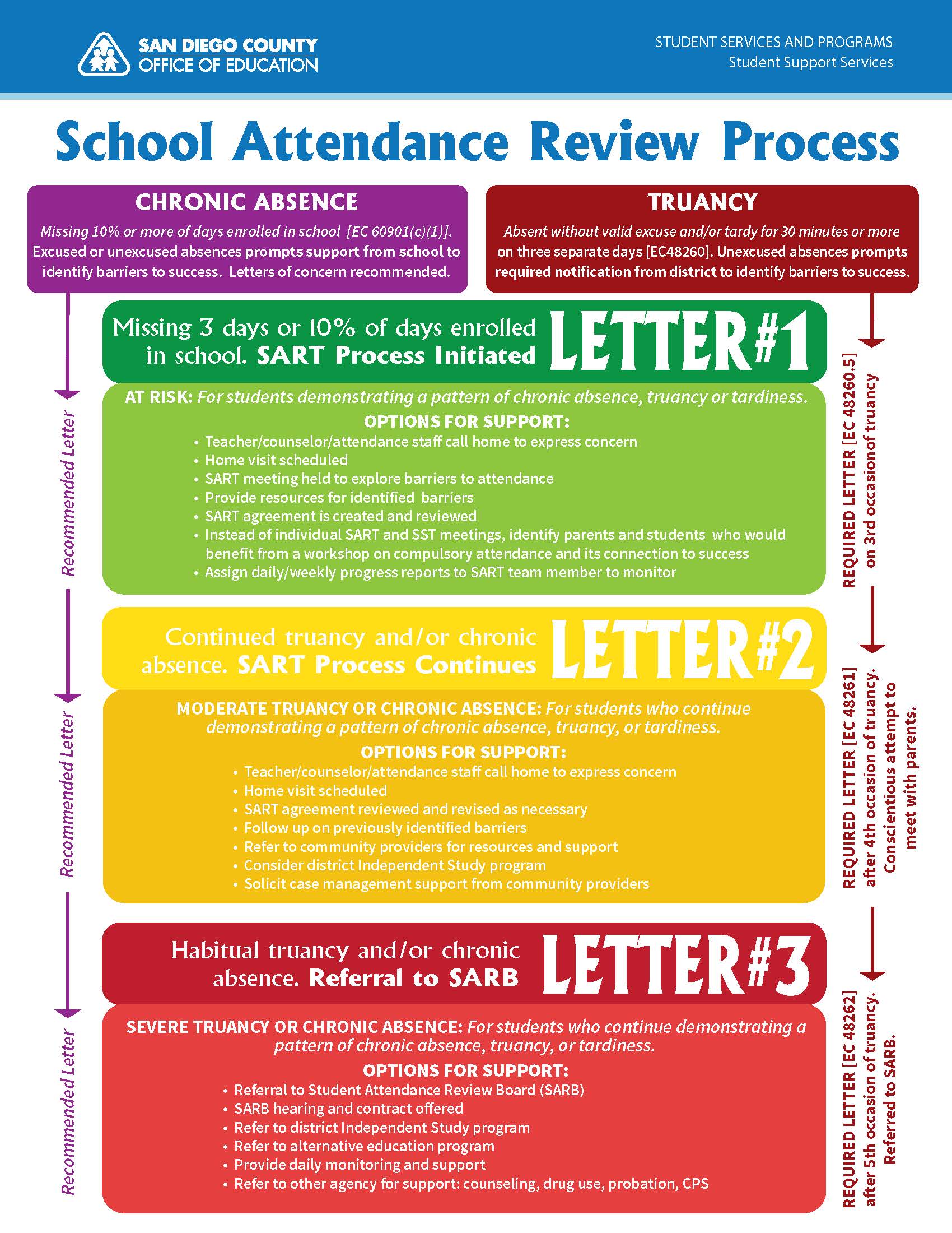 2. Second Notification (SART): If the pattern continues after three truancy reports, the student is referred to the Student Attendance Review Team (SART). A mandatory meeting between the school, parent, and student is required. Sample Second Letter.